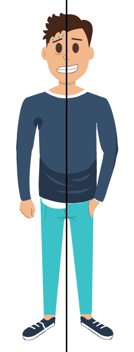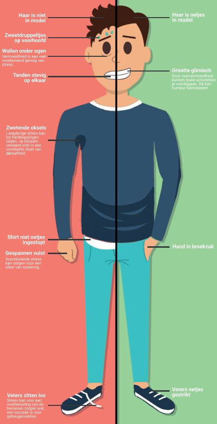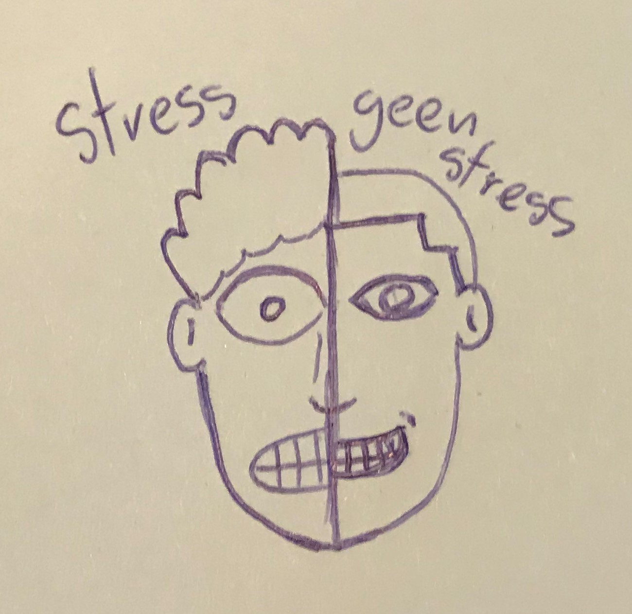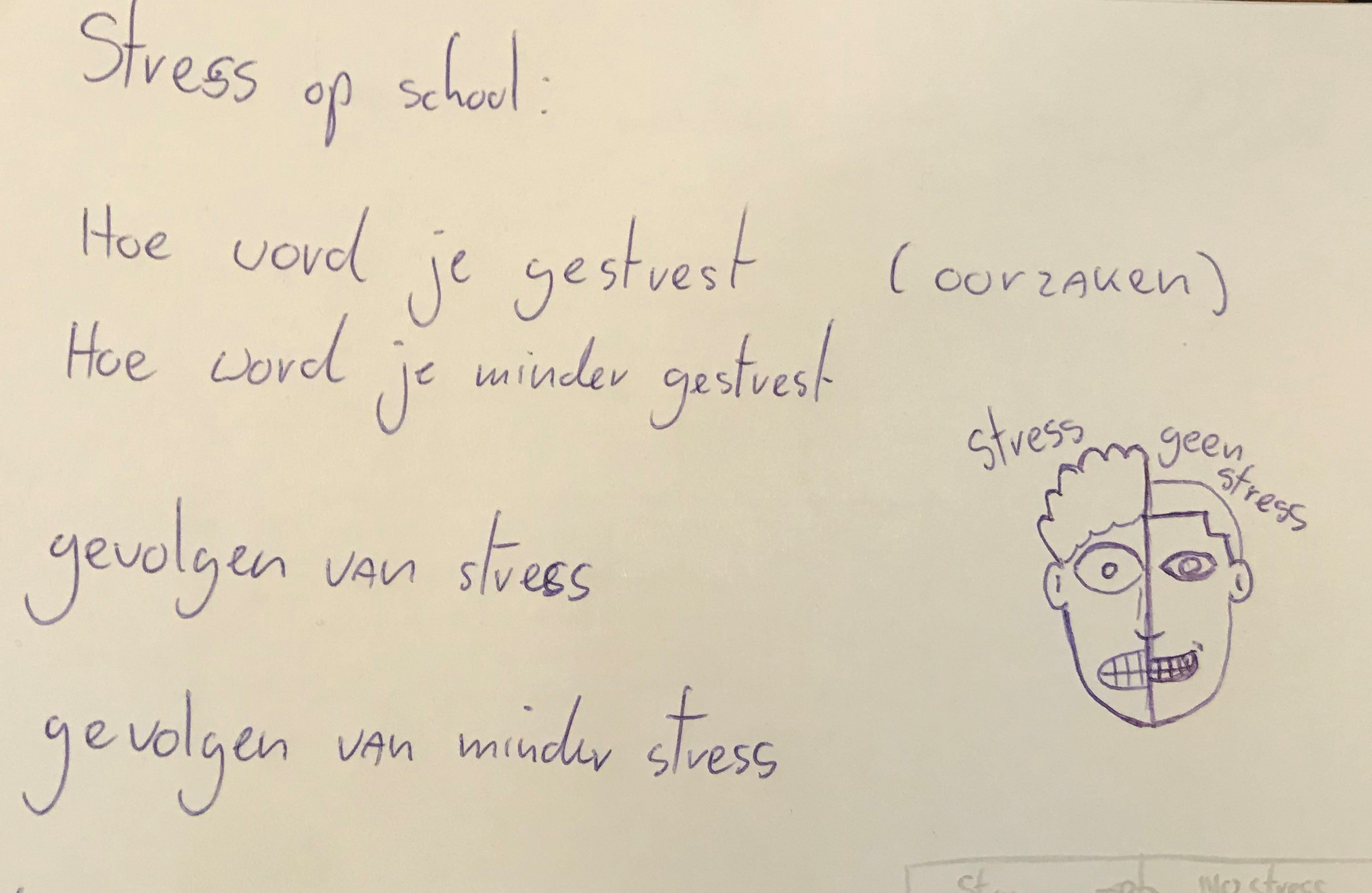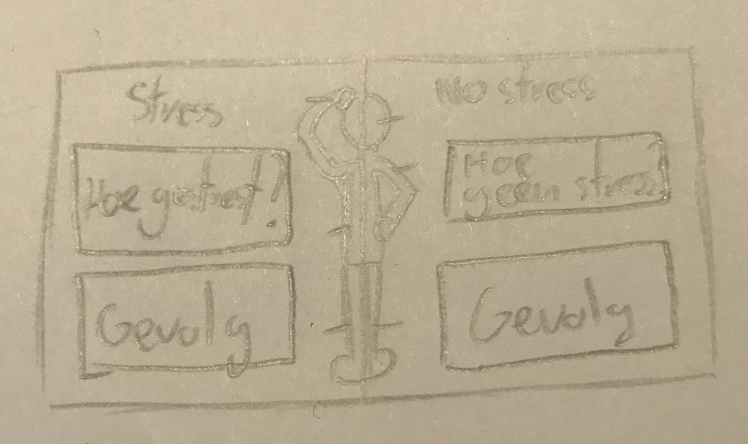 Ook het ontwerp van de student is ontstaan door een simpele schets. De splitsing geeft de twee kanten van de student weer. Symptomen van de gestreste of niet-gestreste student worden beschreven.