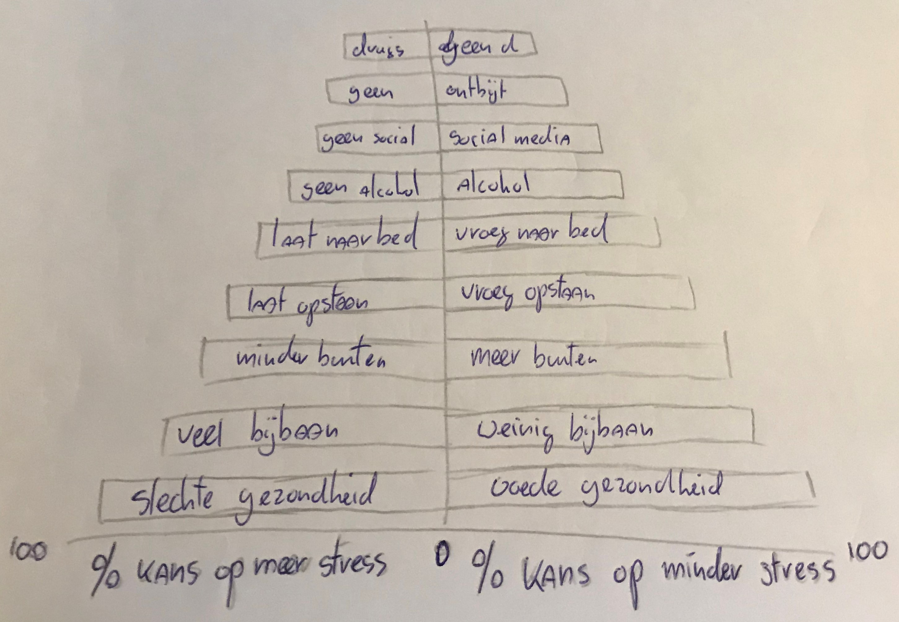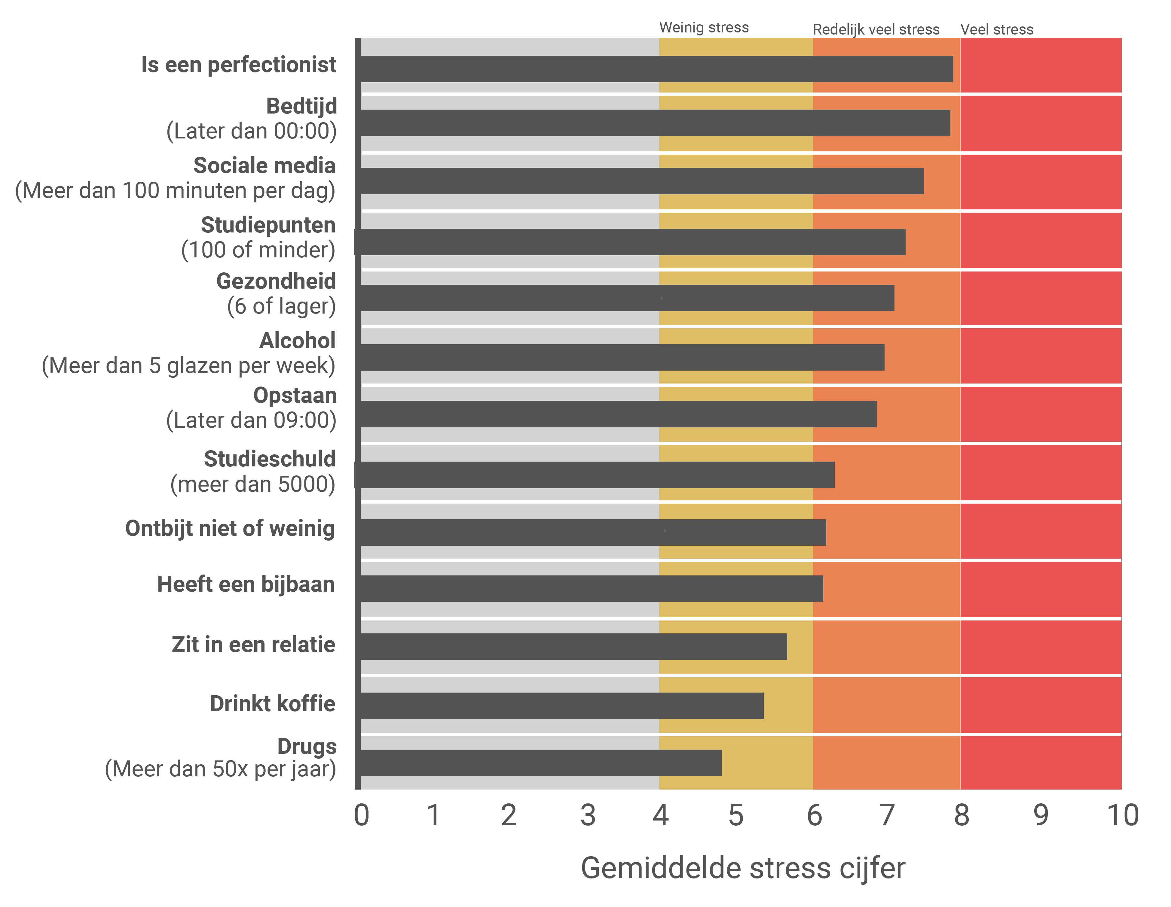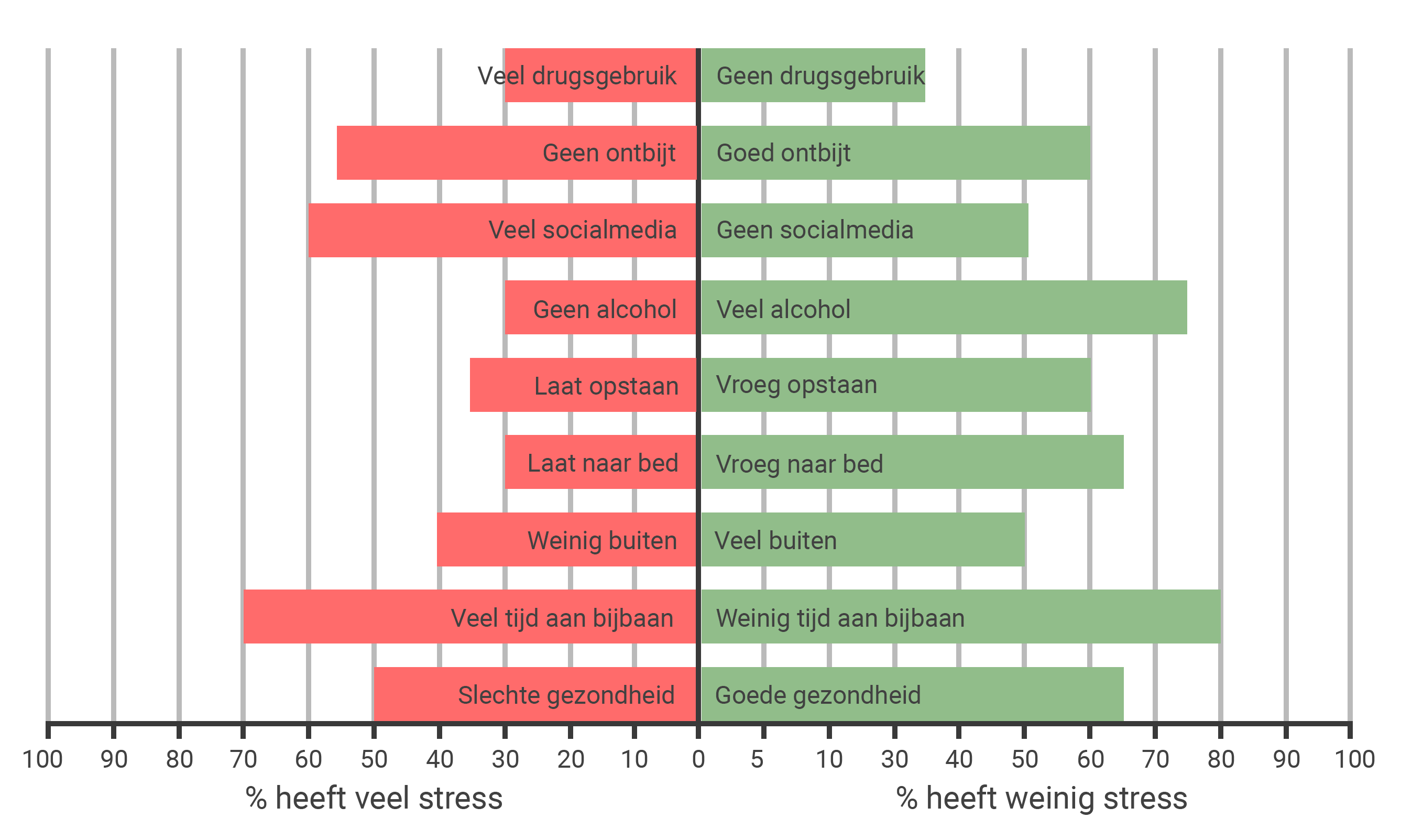 Deze barchart laat zien hoe verschillende bezigheden van een student gevolgen hebben tot veel of juist weing stress.