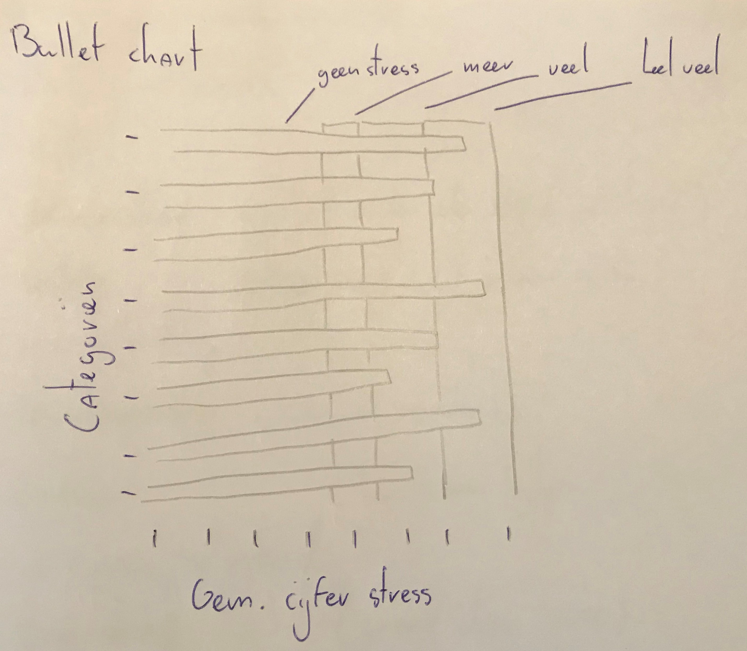 Een bullet chart geeft aan welke eigenschappen van de student overeenkomen met een hoog stress-cijfer. Het stress-cijfer is een getal van één tot tien wat de studenten zichzelf hebben gegeven.