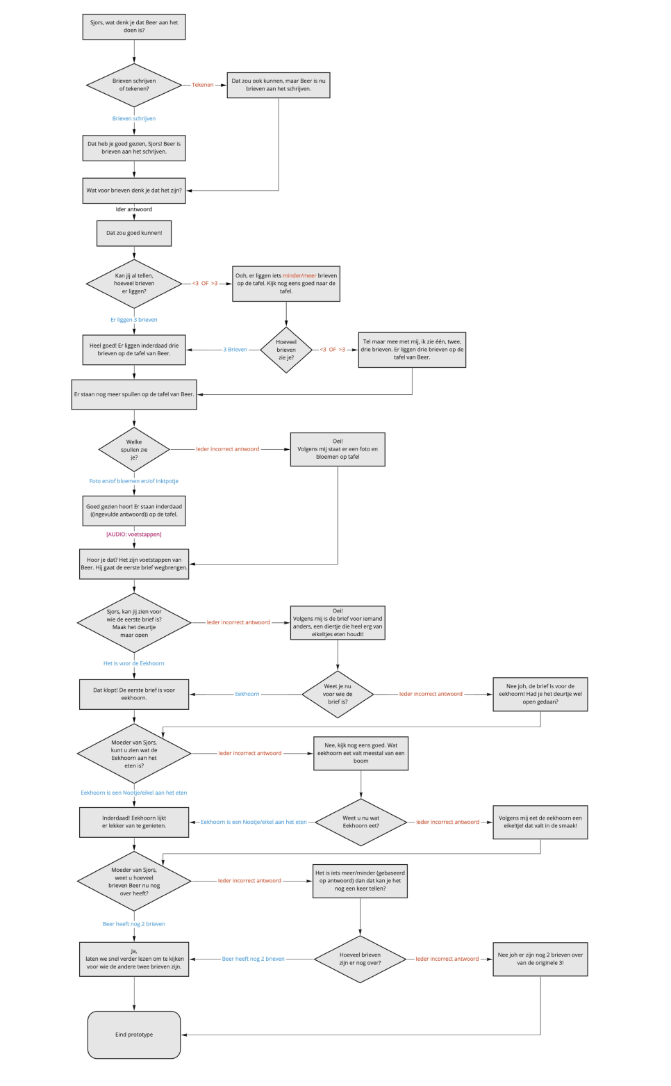Om ons concept te demonstreren hebben we een prototype ontwikkeld. Hiervoor hebben we uit een kinderboek alle pagina's uitgewerkt tot een interactieve flow. Eerst hebben we de gesprekken uitgewerkt in een flowchart en daarna met behulp van de tool Voiceflow een werkend prototype gemaakt. In dit prototype hebben we ook non-ideale flows verwerkt.